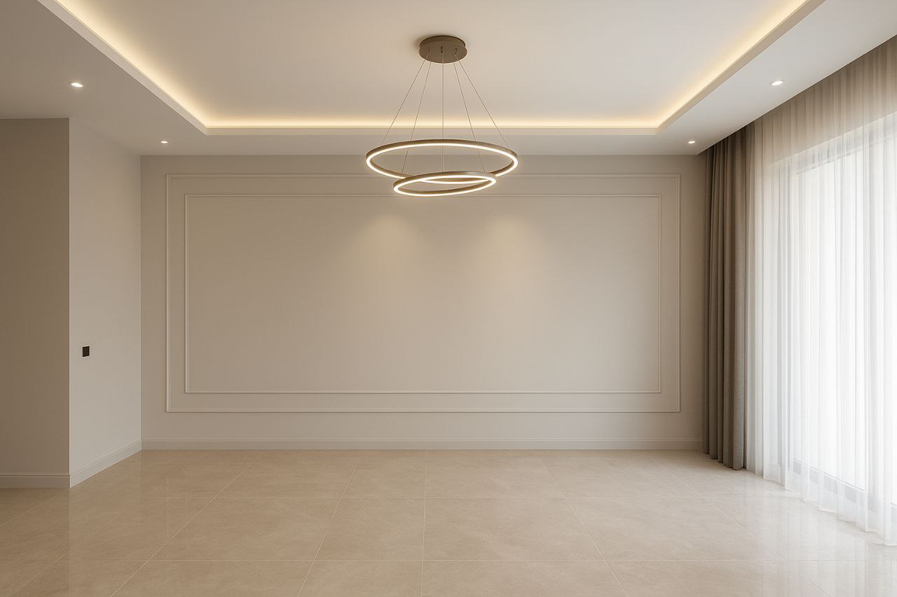 بعدها تم تركيب ألواح الجبس بورد، معالجة الفواصل، والدهان النهائي للحصول على سطح ناعم ومستوي بدون خطوط أو تشققات. كما تمت إضافة إضاءة LED مخفية تعطي لمسة هادئة وتبرز جمال التصميم.